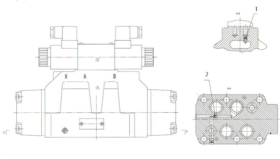 При электрогидравлическом управлении в качестве управляющего золотника используется 4WE6 J (34 сх) для трехпозиционных распределителей, 4WE6 D (574 сх) для двухпозиционных (кроме схем с двухсторонним управлением).