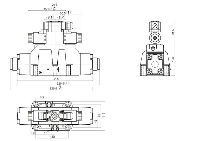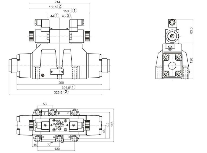 Габаритные размеры гидрораспределителей золотниковых типа 4WEH25 с магнитами постоянного тока, прямым подключением (клеммная коробка)