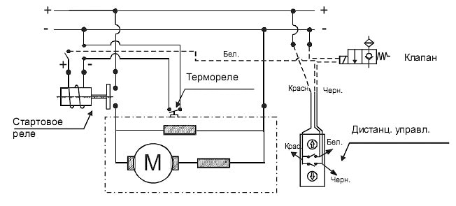 Электрическая схема подключения двигателя постоянного тока с пусковым и термореле в гидростанциях для привода одностороннего гидроцилиндра:
