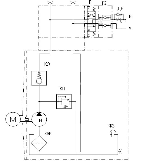 Гидрозамок исключает утечки и самопроизвольное опускание платформы. Скорость подъема регулируется дросселем с обратным клапаном.