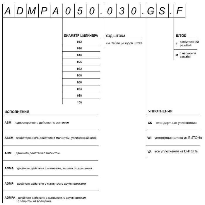 | Исполнения | Одностороннего действия (на растяжение либо на сжатие, обратный ход пружина) Двойного действия; С защитой от вращения; С двойным штоком; С двойным штоком и защитой от вращения |