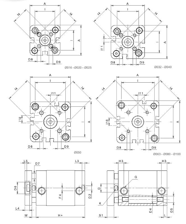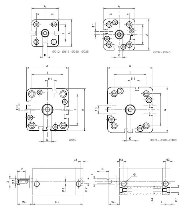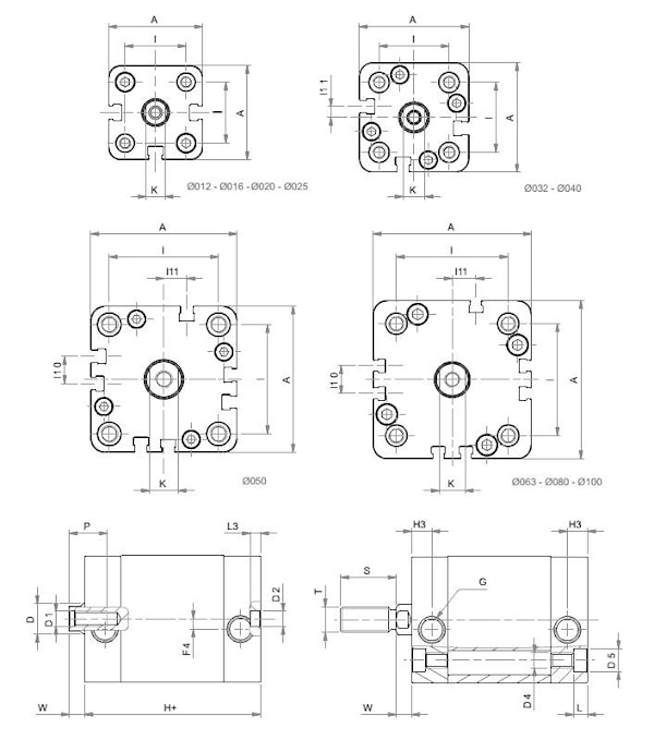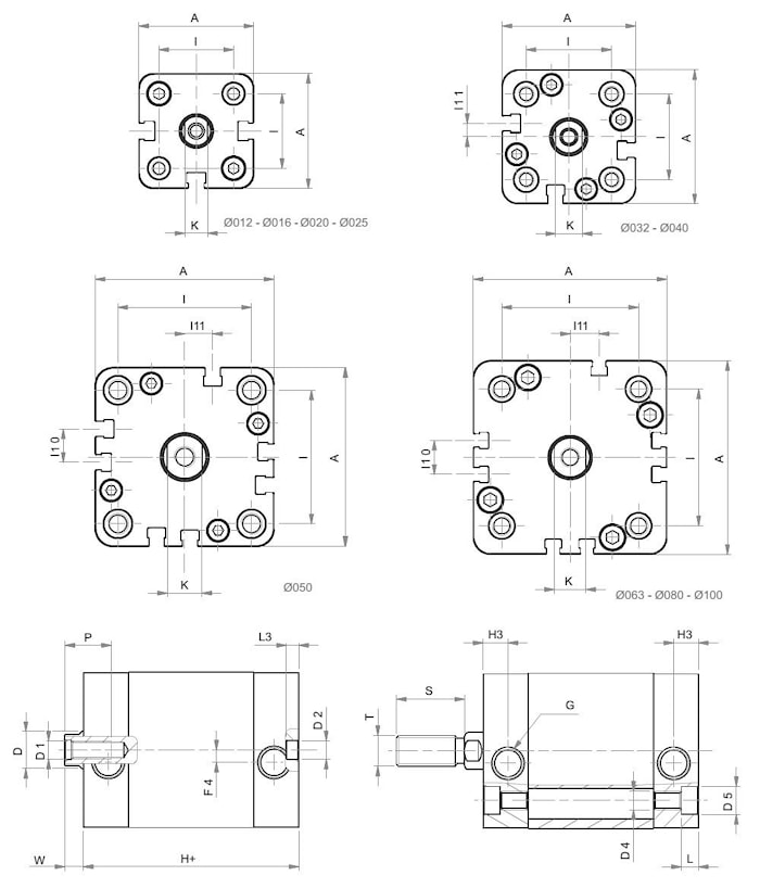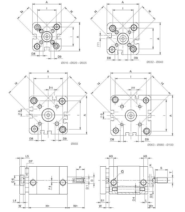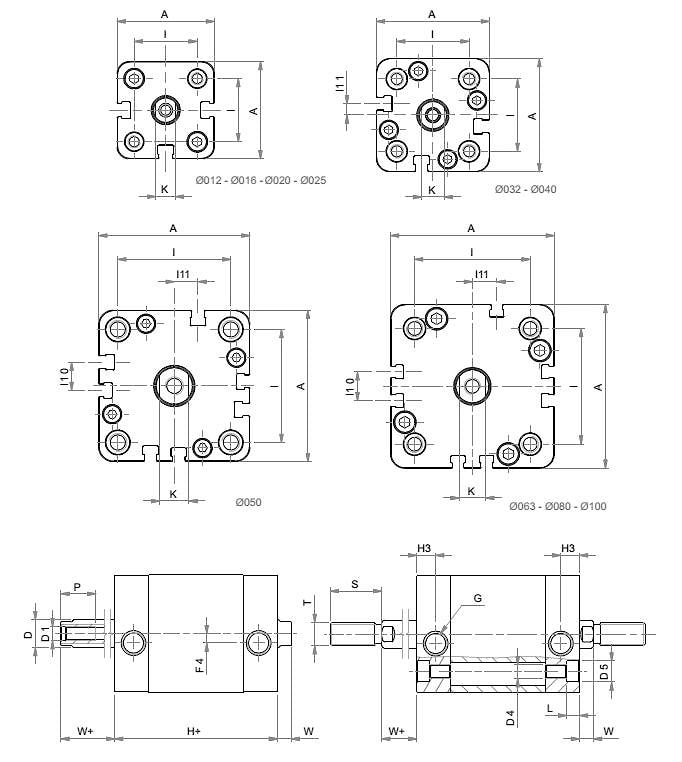 | Диаметр поршня | Ø 012-016-020-025-032-040-050-063-080-100 |