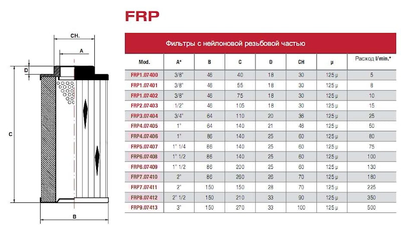 Корпус и крышки фильтров серии FR и FI изготовлены из оцинкованной стали. У фильтров серии FRP резьбовая часть нейлоновая.