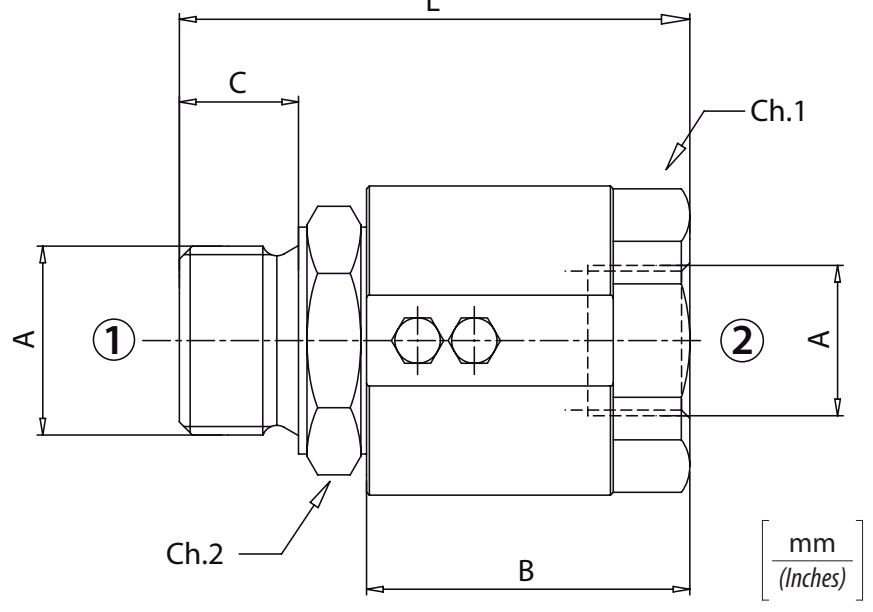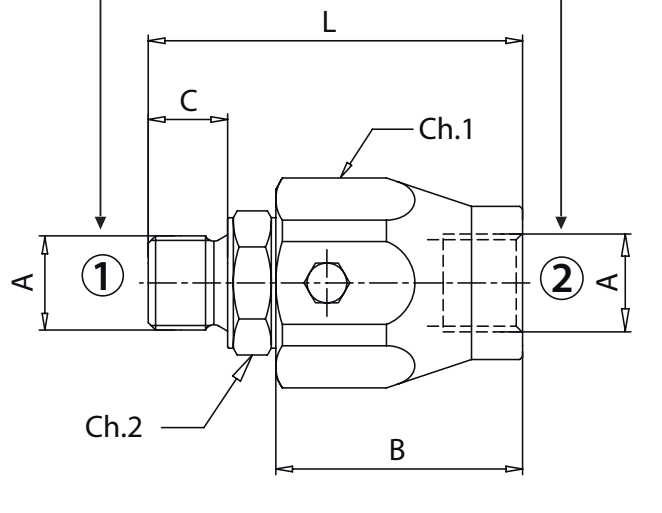 Код | A | Расход макс. l/min | Давление покоя макс., бар. | Давление при вращении макс.,bar | Скорость вращения макс. об/min | B | C | Ch.1 | Ch.2 | L | Масса Kg |