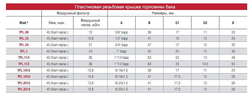 Резьбовая пробка горловины бака с сапуном TPLВ пробку встроен заменяемый воздушный фильтр. Материал фильтра - поролон, тонкость фильтрации - 40 мкм. По запросу возможно применение других фильтрующих материалов.
