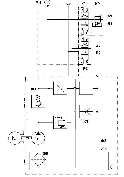 Гидрораспределитель Р1 управляет гидроцилиндром прижима. Усилие прижима регулируется редукционным клапаном КР.