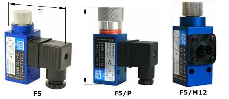 Реле давления типа F5 представляет собой микровыключатель, который срабатывает при достижении предустановленного давления. Заданное давление устанавливается путем поворота внутреннего винта, расположенный в центре корпуса. Внутренний винт под защитным колпачком. Вращением по часовой стрелке давление увеличивается и наоборот - уменьшает значение. Механические упоры защищают пружину и микровыключатель от избыточного давления. В "F5-Р" исполнении регулировка производится ручкой. Применяется в компактных системах, где не требуется частое изменение настройки давления.