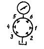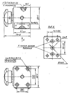 В оттянутом положении маховичка посредством сверлений в золотнике обеспечивается сообщение манометра со сливом, и запирание линий, связанных с точками замера, давления (это положение изображено на рисунке). В утопленном положении маховичка манометр сообщается с одной из точек замера, а слив перекрывается. Вращением маховичка можно последовательно контролировать, давление во всех шести точках замера давления (при переходе от одной точки к другой соришь манометр со сливом необязательно).