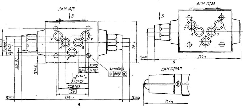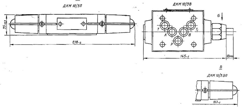 Исполнения ДКМ 10/ЗА и ДКМ 10/ЗВ отличаются тем, что со стороны каналов соответственно J и А в расточке корпуса взамен колпачка 5, регулировочного винта 6, дросселя 13 и пружины 12 установлены технологические втулка и пробка,