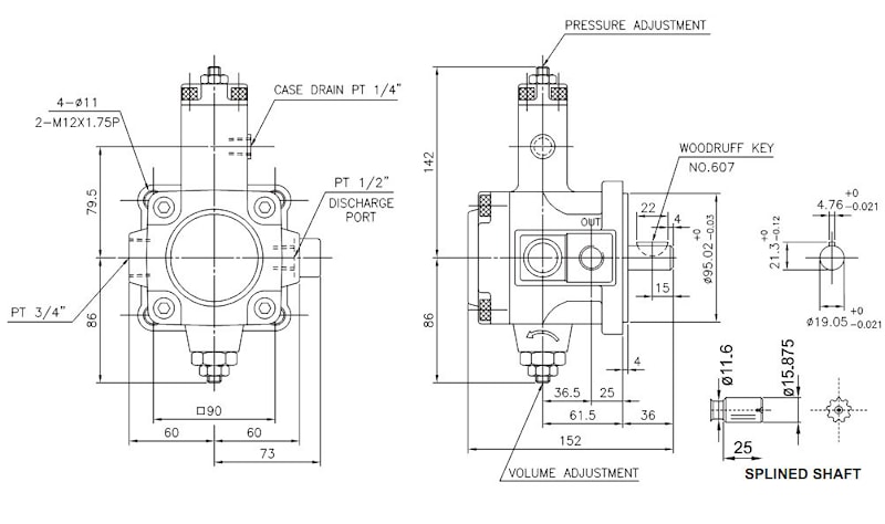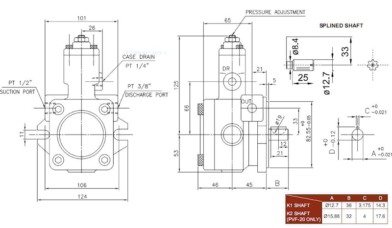 Размеры однопоточных пластинчатых насосов с цилиндрическим валом PVF-8, 12, 15, 20: