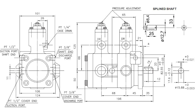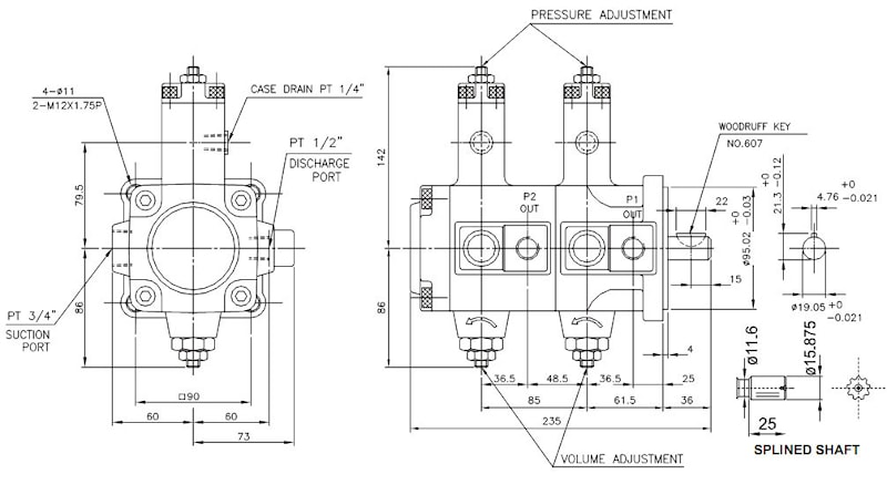 Размеры двухпоточных пластинчатых насосов с цилиндрическим валом PVDF-12-*-12-*, 15-*-15-*, 20-*-20-*: