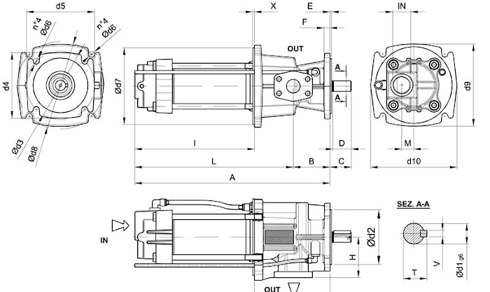 | Модель | A | B | c | D | E | F | H | I | L | M | IN | OUT | T | V | di | d2 | d3 | d4 | d5 | d6 | d7 | X | d8 | d9 | d10 | z |