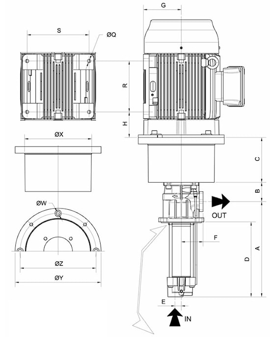 | Размер | Мотор | | IN | OUT | A | B | c | D | E | F | G | H | R | s | Q | x | Z | Y | W |