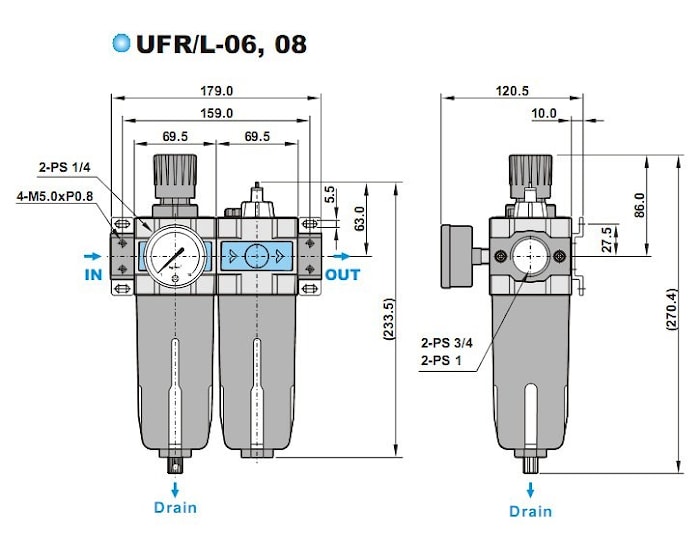 Блоки подготовки сжатого воздуха типа UFR/L регулируют и поддерживают давление, позволяют осуществлять визуальный контроль.