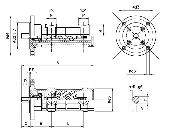 | Размер | A | B | C | D | E | F | L | M | N | P | T | V | d1 | d2 | d3 | d4 | d5 | d6 |