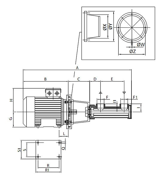 | Мотор | A | B | C | D | E | F | F1 | G | H | I | I1 | L | Q | R | R1 | S | S1 | W | X | Y | Z | |